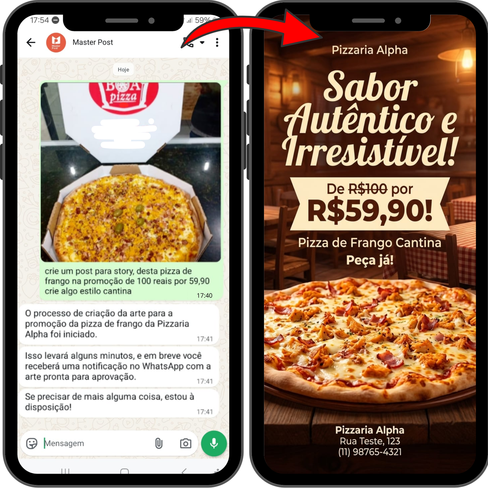 O Master Post é um serviço que cria posts profissionais com imagem e legenda, entregues direto no seu WhatsApp. Você só envia sua ideia, promoção ou foto e recebe o conteúdo pronto para publicar nas redes sociais — sem precisar de apps, Canva ou designers.